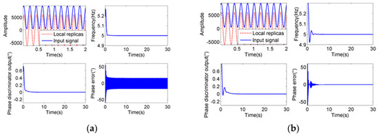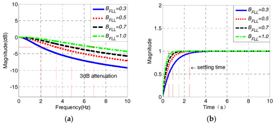 As shown in Figure 13a,b, the responses pattern of FLL with different parameters is similar to that of PLL. The larger the bandwidth is, the greater the 3 dB attenuation frequency and the shorter the settling time would be. In order to enable the FLL to track the input signals with all possible frequencies, the frequency at −3 dB point must be less than 3 Hz when it is used to track the input signals with a minimum frequency, where the bandwidth is set to about 0.3 Hz in that case. The function of FLL in the combined tracking loop is to lock the frequency of input signals as quickly as possible, and help pull the loop into the phase-locking state. When the frequency of input signals increases, the bandwidth of FLL can be appropriately enlarged to shorten the settling time and make it faster to track the frequency of input signals.
