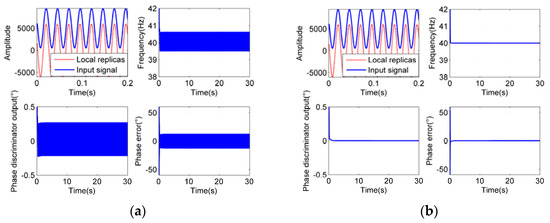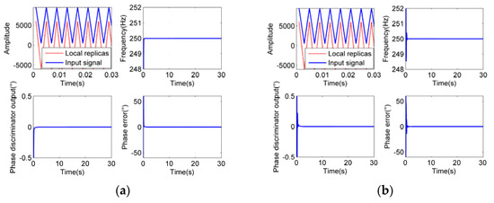 As we can see from Figure 14, Figure 15 and Figure 16, when the integration time Troll is half of the period (Troll = (2n − 1) T/2, n = 1, 2, 3…), the phase errors of tracking results appear to be larger. When the integration time Troll is integer multiple of the period (Troll = nT, n = 1, 2, 3…), the phase errors appear to be the slightest. And when the integration time is more than 5 times larger than the period of input signals (Troll ≥ 5T), it has little effect on the tracking precision, which exactly proves our analysis.