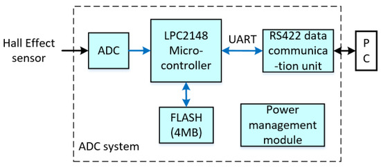 The electrical level of the Hall Effect sensor was recorded by an ADC circuit board with a sampling rate of 100 Hz, which was implemented on the LPC2148 microcontroller with a 10-bit successive approximation analog to digital converter, which is manufactured by NXP Semiconductor (Philips, Eindhoven, Netherlands). The sampling date was stored in a flash memory and read by PC via RS422 after the experiment. The block diagram of the ADC system is shown in Figure 19.