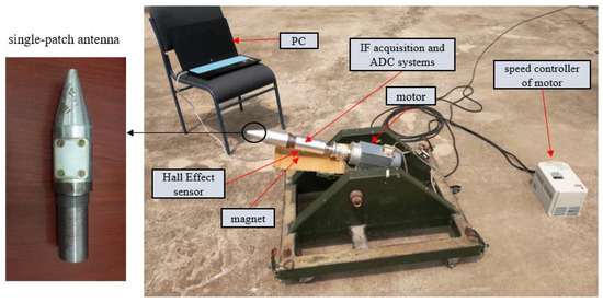 The installation of the experimental devices is shown in Figure 20. The intermediate frequency acquisition system, ADC system, Hall Effect sensor, and the single patch antenna spun with the vehicle together. When the Hall Effect sensor is activated by the magnet, it produces a low-level pulse as a zero-phase mark point. The magnet is settled below the spinning part of the rotary machine when the center of the antenna is facing the ground, it activates the Hall Effect sensor. The patch antenna was inserted into the vehicle by cutting off the side surface of it, and we adjusted the radiation characteristics of the antenna by integral design with the vehicle, so that the antenna has similar radiation characteristics to the unmounted patch antennas.