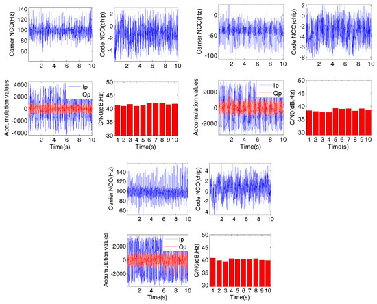 Carrier and code tracking results of different spin rates of 3.8 r/s (top left group), 6.4 r/s (top right group), and 7.5 r/s (bottom group).