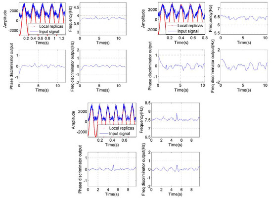 Roll modulation signals tracking results of different spin rates of 3.8 r/s (top left group), 6.4 r/s (top right group), and 7.5 r/s (bottom group).