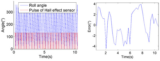 The detected roll angle is compared to the Hall Effect sensor measurements, as shown in Figure 23, on the left. The deviations of estimated roll angles are shown in Figure 23, on the right. And the overall standard deviations of the roll angle estimation errors are shown in Table 3.