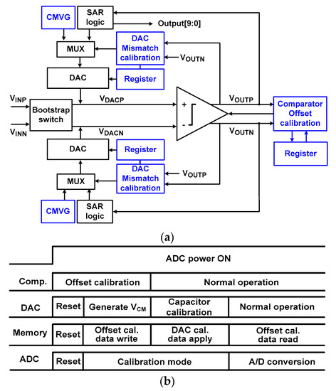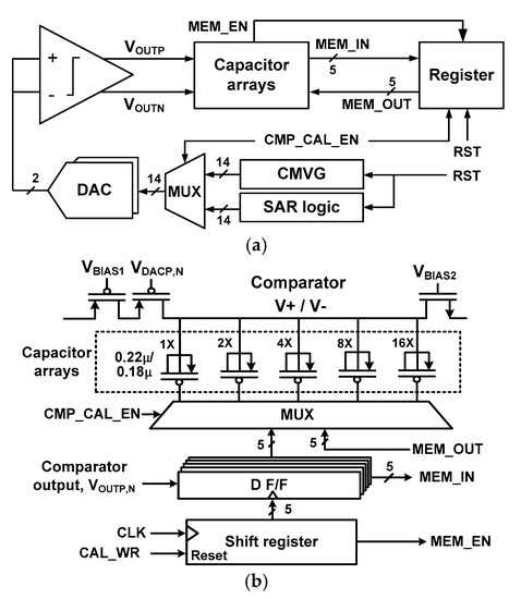 Taking advantage of scaled-down complementary metal–oxide–semiconductor (CMOS) process, various digital calibration techniques have been reported [10,11,12,13]. In reference [11], a low-power calibration technique is presented where circuit blocks, except for the DAC and comparator, are implemented in a field programmable gate array (FPGA). Because the capacitive DAC operates as a single-ended circuit for error evaluation, this approach is rather sensitive to the CM noise. Moreover, the digital calibration usually requires computationally intensive post-processing, and thus, is not suitable for battery-operated low-power sensing applications.