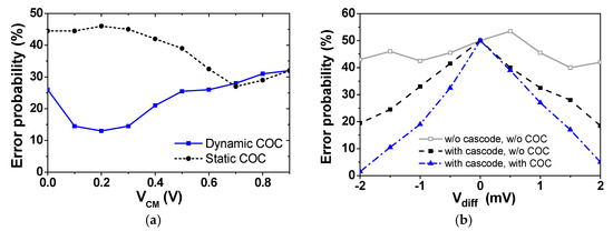 In addition, we evaluate the error probabilities as a function of Vdiff. Figure 3b shows the error probability of three comparators. The result is obtained by performing 1000 Monte Carlo simulations that consider both local and global process variation under a TTT corner. The result confirms that the error is significantly reduced when both cascode and COC are used. In the next section, we describe the implementation details for realizing dynamic COC.