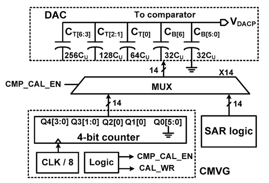 The proposed ADC supports a dual calibration technique for COC and DAC capacitor mismatch calibration. During the COC, we note that the capacitive DAC is not used for analog-to-digital (A/D) conversion. To realize the calibration without using separate circuit blocks, the DAC is reused for implementing the common-mode voltage generators (CMVG). During COC, a multiplexer (MUX) array selects inputs from the CMVG for the DAC. During normal A/D conversion, the inputs from SAR logic are selected. The linearity of SAR ADC is affected by the mismatch in the capacitive DAC. Because high mismatch errors occur for the large capacitors, the DAC mismatch calibration is applied to upper CT[i] arrays. To realize the calibration in an energy and area-efficient manner, the lower CB[i] are not calibrated; they require sufficient intrinsic linearity. Otherwise, they set the upper limit on performance.
