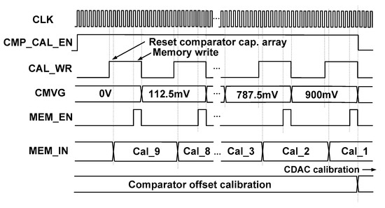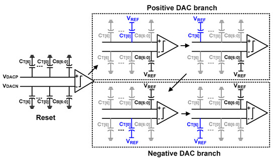 Figure 9 shows the sequence of the calibration for detecting the DAC capacitor mismatch. The DAC array consists of CT[i] and CB[i]. We note that the one-bit of CT[i] has a weight of 64CU. Under the ideal matching condition, the sum of binary capacitors from CB[6] to CB[0] has the same weight, 64CU. For the DAC capacitor mismatch calibration, we detect the difference between VDACP and VDACN, which can be used to evaluate the mismatch between the upper and lower DAC. The proposed approach is different from the previous works [7,8,11], which evaluate the mismatch using the DAC in the same branch. Although the previous approach can potentially achieve a better calibration result, it requires a rather complicated calibration logic as well as additional calibration DAC. By reusing the offset-calibrated comparator, our approach evaluates the mismatch in the DAC capacitor without a separate circuit block. A small mismatch in the DAC capacitor leads to a slight difference between VDACP and VDACN, which leads to a large comparator delay for generating output. In the case of a large mismatch, the comparator generates output with a relatively short delay. The delay is encoded using two-bit data for each CT[i]. Due to circuit complexity, CB[i] is not calibrated.