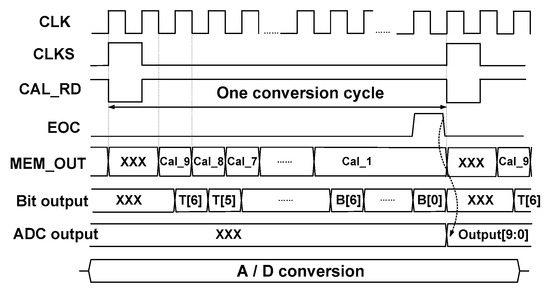 Figure 8 shows the timing waveform during the normal A/D conversion when the COC is applied. Before the comparator makes a decision, the calibration data MEM_OUT [4:0] are applied to the comparator. When CLK_RD becomes high, MEM_OUT [4:0] are read, which sets the state of the capacitor array in the comparator. When the comparator makes a decision, thermometer-coded bits T[6:0] and binary-coded bits B[6:0] are sequentially generated. When the B[6:0] switches, VCM is already close to the ground and does not change significantly. Therefore, Cal_1[4:0] is used during this period. With the end-of-conversion (EOC), the ADC generates outputs.