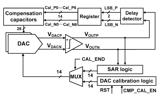Figure 10 shows the block diagram for realizing the proposed DAC mismatch calibration. It consists of a DAC calibration logic, a delay detector, registers, and compensation capacitors. During mismatch calibration, CAL_END selects the MUX to receive the input from the DAC calibration logic. The calibration logic sequentially controls the bottom plate of capacitors in the positive and negative DACs. Then, the delay detector generates LSB_P[1:0], which indicates the mismatch data of the positive DAC (LSB_N[1:0] for the negative branch). The two-bit outputs are sequentially written seven times into the register. When the mismatch evaluation is finished for CT[0:6], the mismatch data are retrieved from the register. There are seven register outputs for positive (Cal_P0[1:0]-Cal_P6[1:0]) and negative (Cal_N0[1:0]-Cal_N6[1:0]) branches. These outputs are used to set the compensation capacitors attached to each CT[0:6].