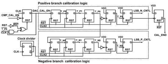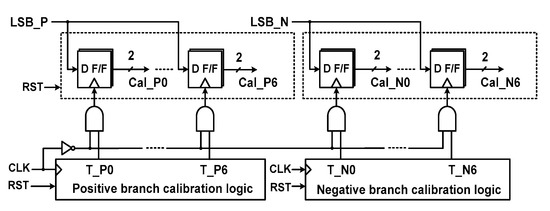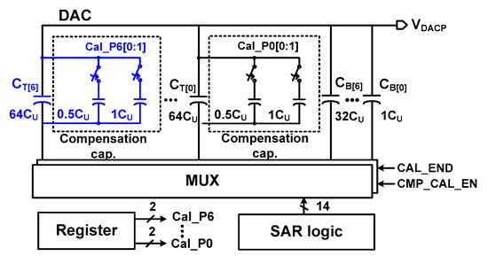 By the delay detector, two-bit data (LSB_P[1:0] and LSB_N[1:0]) for each CT[0:6] in the two branches are generated. By the calibration logic, the data are sequentially written in the register (Figure 14). The data are used to control the switch for the compensation capacitors attached to each CT[0:6], as shown in Figure 15. Each compensation capacitor consists of 0.5CU and 1.0CU. The value of the capacitors is chosen considering a worst-case mismatch (2%) of 64CU. The effect of calibration can be enhanced by using both add and subtract operations. The subtract operation is implemented by taking advantage of the differential structure [22]. To simplify the logic for the subtract operation and consider the layout parasitic, the size of the original DAC capacitors is reduced by 0.5CU. Then, the error compensating range is from −0.5 to +1 LSB in the 0.5 LSB step.