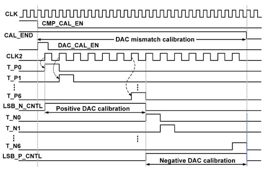 Figure 12 shows the timing waveform of the DAC calibration logic. The low-level transition of the CMP_CAL_EN signal indicates the end of COC. Then, the DAC_CAL_EN signal is enabled to perform the DAC capacitor mismatch calibration and the shift registers in the positive branch calibration logic start operation. First, T_P0 becomes active to switch the bottom plate of capacitor CT[0] in the positive branch. During this time, LSB_N_CNTL controls the bottom plate of capacitors CB[6:0] in the negative branch. The LSB_N_CNTL is enabled until mismatch evaluations are performed for all CT[0:6] in the positive DAC branch. The negative branch calibration logic operates in a similar manner using LSB_P_CNTL. When the DAC mismatch calibration is finished, CAL_END becomes low.