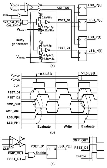 Figure 13b shows the timing waveform where the mismatch is evaluated in the positive DAC branch. When the mismatch is small, the difference between VDACP and VDACN is also small, resulting in a relatively long delay in the comparator [21]. For example, consider the case when the mismatch is more than 0.5 LSB but less than 1.0 LSB. In the evaluation phase, rises after PSET_D1 which sets LSB_P[0] to high and LSB_P[1] to low. The LSB_P[0:1] is subsequently written to the register. When the delay detector samples the output of the comparator using D F/F, meta-stability can occur. To remove this, we insert a logic gate to generate an Enable signal as shown in Figure 13c. In this way, the Enable signal provides the clocks for D F/F in a well-defined sequence and removes meta-stability.