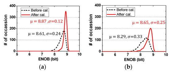 Figure 16 shows the probability distribution of an effective number of bits (ENOB) before and after the mismatch calibration. In the case of 1% mismatch, the average ENOB before and after calibration is 8.61 and 8.87 bits, respectively. The standard deviation is reduced from 0.24 to 0.12 bits by the calibration. In the case of 1.5% mismatch, the average ENOB improves from 8.29 to 8.65 bits. The standard deviation is reduced from 0.33 and 0.25 bits after calibration. The binary-weighted capacitors are not calibrated. With the quantization noise and the discrete value of compensation capacitors, these set the upper limit on performance after calibration. In the case when the binary capacitors are calibrated, the ENOB improves by 0.3–0.4 bits depending on the mismatch. In addition, we perform simulations for static nonlinearity. For 2% mismatch, the peak DNL is +0.09/−0.63 LSB before calibration and it is reduced to +0.08/−0.32 LSB after calibration. The peak integral non-linearity (INL) is +1.71/−1.72 LSB before calibration and it is improved to +0.74/−0.75 LSB after calibration. The result shows that the proposed DAC mismatch calibration is effective at improving both dynamic and static performances of the ADC.
