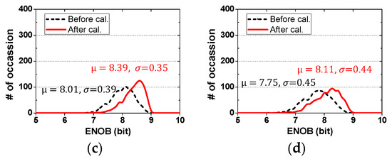 Probability distributions of an effective number of bits (ENOB) before and after DAC capacitor mismatch calibration. Capacitor mismatches are (a) 1.0%, (b) 1.5%, (c) 2.0%, (d) 2.5%.