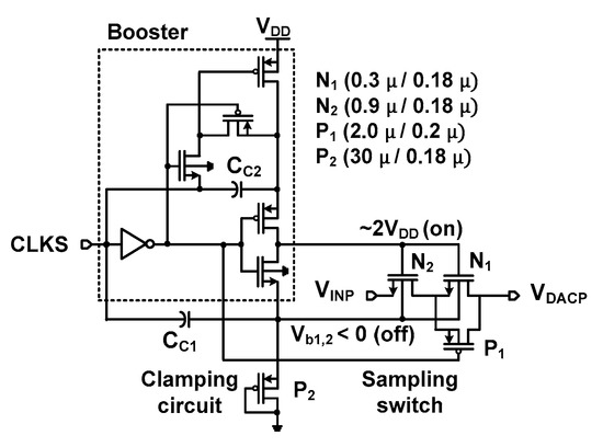 Figure 17 shows the proposed bootstrap sampling switch. Based on the previous work [23], it is modified to reduce leakage-induced error (off-state) and sampling error (on-state). It consists of a booster, a sampling switch, and a clamping circuit.