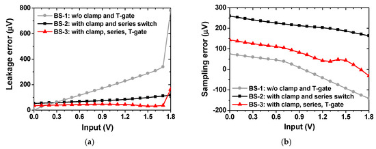 Figure 18a compares the leakage-induced error as a function of VINP. The result is obtained from post-layout simulations with a sampling rate of 3 kS/s. The VDACP is measured at 1 ms after the input VINP is sampled. Three cases of the bootstrap switch (BS) are shown; (1) BS-1 having transmission-gate without a clamping circuit; (2) BS-2 having a clamping circuit and the series switch (N1 and N2) only [23]; (3) BS-3 having a clamping circuit and the transmission-gate (Figure 17). In the case of BS-1, the leakage-induced error increases with VINP reaching 800 μV at VINP = 1.8 V. The result shows that BS-3 has a smaller error than that of BS-2 except at VINP = 1.8 V; BS-3 shows a leakage-induced error less than 50 μV up to VINP = 1.7 V. The worst-case error is 180 μV. Figure 18b shows the sampling error as a function of VINP. The turn-on voltage of the sampling switch is 2VDD. The gate-to-source voltage Vgs of the switch, thus, the turn-on resistance depends on VINP. This causes the sampling error to vary with the input. A constant Vgs bootstrapping technique is reported [24]; it can be challenging to implement this technique under different process corners. Another work focuses on reducing the turn-on resistance only [25]; this approach can suffer from the leakage error when operated at a low sampling rate. The result shows that the BS-3 shows overall smaller error than that of BS-2; the sampling error is reduced by using a transmission-gate. BS-3 shows a worst-case sampling error of 150 μV, which is higher than that of BS-1. However, the high leakage-induced error of BS-1 is not suitable for our application.