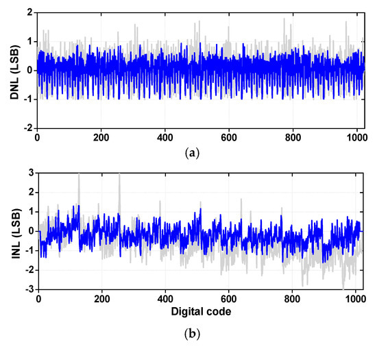 Measured static nonlinearity of ADC. (a) differential non-linearity (DNL), (b) integral non-linearity (INL).