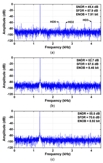 Measured output spectra of the ADC. (a) Before calibration, (b) after comparator offset calibration, and (c) after both comparator offset and DAC capacitor mismatch calibrations. fS = 9 kS/s, fIN = 1.32 kHz.