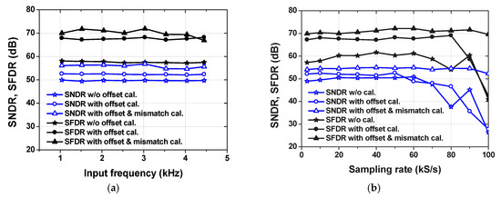 Figure 22a shows the measured SNDR and SFDR before and after calibrations as a function of input frequency fIN. Figure 22b shows the measured SNDR and SFDR before and after calibrations for sampling rate fS up to 100 kS/s. We characterize the ADC using a high fIN.