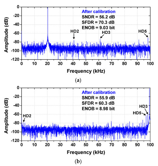 Figure 23 shows measured spectra of the ADC for fIN = 20.35 kHz. When both COC and DAC calibration are performed, the measured SNDR and SFDR are 56.2 and 70.3 dB, respectively, resulting in an ENOB of 9.0 bits. At the Nyquist frequency, the measured SNDR and SFDR are 55.9 and 60.3 dB, respectively.