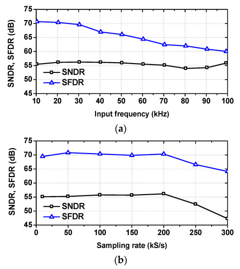 (a) Measured SNDR and SFDR at different input frequencies. fS = 200 kS/s, (b) Measured SNDR and SFDR at different sampling rates. fIN = 4.35 kHz.