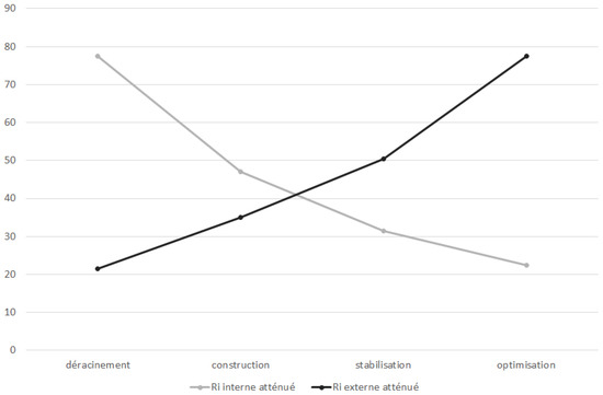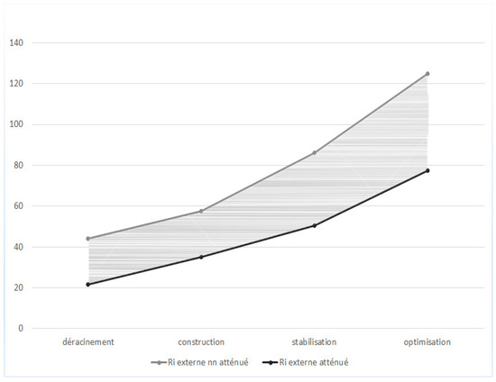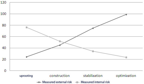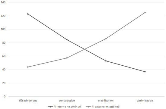 Alter and Sherer [41] distinguish between a permanent and a temporary risk, but we consider that any risk is a temporary risk since its probability or impact may be zero at a specific time t. In addition, we add the estimates of events to each organizational transformation phase to quantify the evolution of internal risks and external risks. If a risk is both external and internal, we divide its estimate by two. For each phase, we obtain two values for each type of risk: A minimum value (attenuated risk) and a maximum value (non-attenuated risk). These values make it possible to define a variation interval [RiA; RiNA]. There is a gradual increase of 1/2 of the external risks and a reduction of 1/3 of the internal risks. It is also important to note that the internal risk represents approximately 75% of the total risk at the beginning of a cloud computing project and the external risk represents 25% (see Table 2). These probabilities are reversed at the end of the project. Therefore, we propose the second hypothesis as follows.