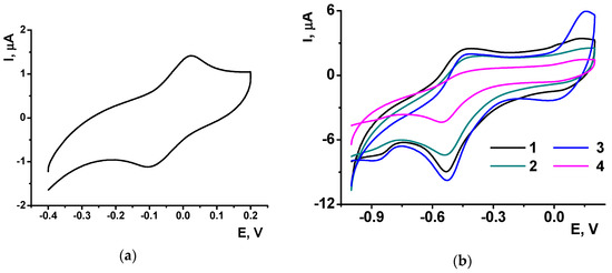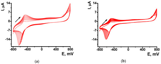 P[5]A gives on the glassy carbon electrode covered with CB a symmetric peak pair at −0.1,…, 0 V (Figure 8a), which remains constant in multiple cycling of the potential in the NR solution. In resulting voltammogram recorded during the electropolymerization in the NR solution, the P[5]A signal is suppressed against that of the NR though its position on the potential axe remains the same as on bare electrode covered with CB.