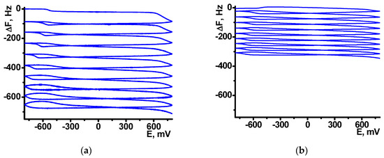 Figure 2. The electrochemical quartz crystal microbalance sensograms recorded on Au electrodes of quartz crystal chip during the multiple cycling of the potential in the 0.4 mM NR solution in 0.025 M phosphate buffer + 0.1 M NaNO3 (рН = 6.0) in the absence (a) and in the presence of 0.2 mg/mL DNA (b).