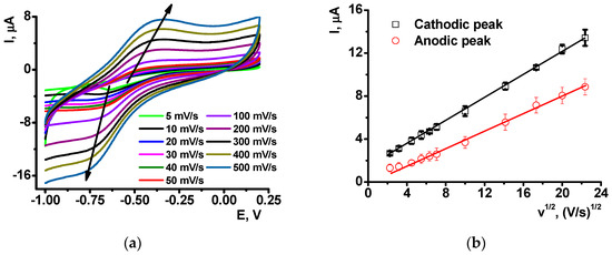 After the NR electropolymerization, the electrodes were transferred in the working buffer with no monomeric dye and the redox activity of the coating was assessed using direct current voltammetry. As on the electropolymerization stage, one reversible peak was found in the same peak potentials corresponded to the poly-NR redox activity. The peak currents changed with the potential scan rate in accordance with formal diffusional limitation of the electron transfer (Figure 3). As no monomers were contained in the solution, diffusional limitation can be referred to the shuttle mechanism of the electron exchange between reduced and oxidized NR units in the polymer chain.