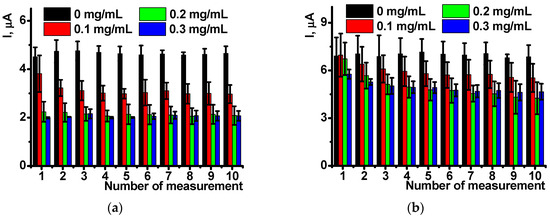 The influence of DNA oxidation on the biosensor behavior was confirmed by modeling experiments with ascorbic acid as an antioxidant. The addition of 1.0 μM–1.0 mM ascorbic acid to the oxidation mixture decreased the influence of oxidation as shown in Figure 9a for 0.1 mM ascorbic acid as an example. This is due to protective effect, i.e., interaction of ascorbic acid with free radical particles generated in Cu2+/H2O2 mixture. The influence of the antioxidant was quantified by calibration Equation (5) expressing the decrease of the DNA damage as a function of ascorbic acid concentration. The absolute cathodic current of poly-NR was chosen as a measure of DNA conditions in the surfaced layer.