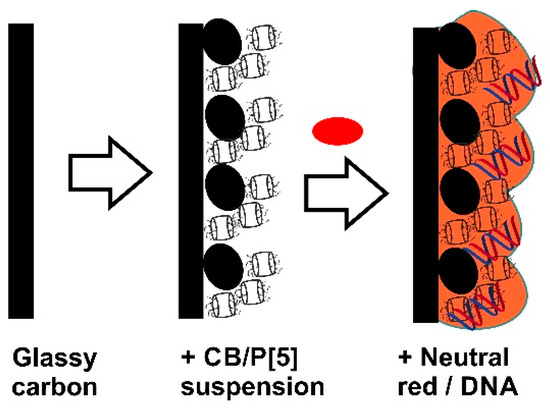 Mediators of electron transfer improve the electron exchange reactions on the electrode interface and promote determination of redox conversion of the analytes and DNA specific agents [42]. Previously it was shown that P[5]A, a macrocyclic compound consisted of hydroquinone units bonded with methylene bridges, can be used in electrochemical sensors due to high sensitivity of redox reactions to the external factors. Thus, DNA promotes the P[5]A redox activity by disturbance of hydrogen bonds between neighboring hydroxyl groups of the macrocycle moiety [37]. Direct adsorption of P[5]A on glassy carbon was found inefficient because its oxidation products suppressed the amperometric signal [35]. For this reason, the electrode was first modified with stabilized adsorbed macrocycle and allowed multiple measurement of its redox activity. The modification was performed by placing of the CB suspended in chitosan and following addition of P[5]A. No significant difference in biosensor performance was found if P[5]A was preliminary adsorbed on the CB followed by deposition of suspension on the electrode or its solution was stepwise added to the GCE covered with the CB particles. As a result, a swell reproducible coating was formed as support for the NR electropolymerization. The protocol of surface layer assembling is schematically outlined in Figure 5.