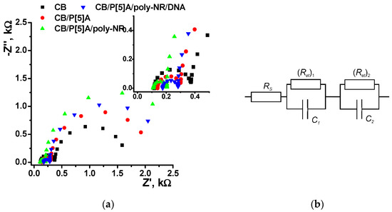 Figure 7. (a) The Nyquist diagram of impedance spectra recorded with glassy carbon electrode covered with CB, CB/P[5]A, CB/P[5]A/poly-NR and CB/P[5]A/poly-NR/DNA layers (Inset: small semicircle area). Measurements in the presence of 0.01 M K3[Fe(CN)6] and 0.01 M K4[Fe(CN)6] at 220 mV vs. Ag/AgCl. Frequency range 0.04 Hz–100 kHz, amplitude 5 mV. (b) Equivalent circuit: RS—solution resistance, Ret—charge transfer resistance, C—capacitance, 1 and 2 indices correspond to the inner and outer interface of the layer.