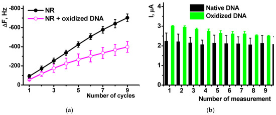 EQCM measurements showed the influence of oxidized DNA on the NR polymerization comparable to that of native DNA (Figure 8a). The mass shift was lower in the presence of oxidized a DNA due to lower effective area of the electrode participation in the electron transfer and hence polymerization and deposition of appropriate products. The comparison of the native and oxidized DNA did not show significant difference in the resulting ΔF value.