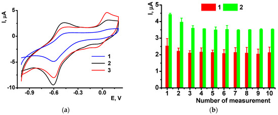 The peaks on votlammograms were quite stable in aqueous solutions. The shape and height of the peaks retain during the working day without significant changes. Figure 4 shows the appropriate dependencies for ten consecutive measurements performed on the same sensor with intermediate stirring of the working solution in open circuit mode. The results are averaged for five sensors.