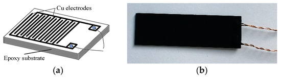 Ni-CNTs (inner diameter: 5–10 nm, external diameter: 10–20 nm, and length: 10–30 μm) were bought from Aladdin Reagent Corporation (Shanghai, China). Figure 1a shows the interdigitated Cu electrodes; Cu electrodes (thickness: 30 μm, gap: 0.2 mm) were fabricated on epoxy resin as a substrate of the Ni-CNT gas sensor. Ni-CNTs were dispersed in dimethylformamide (DMF) to form a solution of 0.025 mg/mL by the following steps: soak 6 h, then ultrasonic treat 2 h. The solution was sprayed onto the surface of the Cu electrodes at 80 °C to accelerate the evaporation of DMF. As shown in Figure 1b, Ni-CNTs evenly distribute on the surface of the Cu electrodes, which benefits the gas molecule adsorption and desorption process.