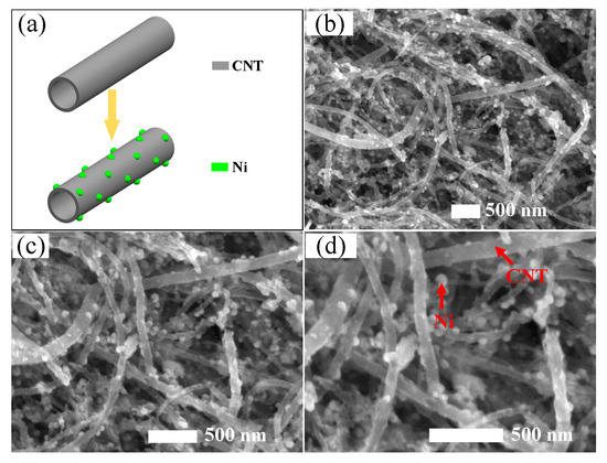 As per the formation mechanism of Ni-CNTs shown in Figure 2a, it is important to make sure that Ni particles evenly decorate onto the outside wall of intrinsic CNTs, which plays a key role to the gas-sensing properties of the prepared Ni-CNT gas sensor. As per the typical TEM images shown in Figure 2b–d with different magnifications, Ni-CNTs evenly disperse on the surface of the prepared gas sensor. Hence, there will be large, hollow structures for gas diffusion among the Ni-CNTs, which not only increase the adsorption capacity, but reduce the adsorption and desorption time. Ni nanoparticles mainly distribute on the outside wall of CNTs due to the long length and closed structure of CNTs (about 30 μm). The small diameter of Ni-CNTs (about 20 nm) signifies large curvature and high surface activity. Besides, the surface defects that existed on the surface of CNTs provide the adsorption sites for gas molecules. As a result, Ni nanoparticles evenly decorate on the surface of CNTs with their size distinctly smaller than the diameter of CNTs. Ni nanoparticles act as the active sites for gas molecule adsorption, which effectively enhances the gas-sensing properties of CNT-based sensors.