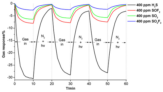 To demonstrate the reusability of the prepared Ni-CNT gas sensor, we have done multiple measurements to obtain its response and recovery properties to different types of SF6 decomposition components at the same concentration (400 ppm). As shown in Figure 4, the flow rate of SF6 decomposition components is 100 sccm during the gas-sensing process, and the N2 flow is used in the recovery process with a flow rate of 200 sccm. In addition, the illumination of UV light is applied to enhance the recovery process as it greatly increases the molecular vibration of SF6 decomposition components. Gas-in and N2 + UV represent the flow of SF6 decomposition components (SO2, H2S, SOF2, and SO2F2) and the flow of pure N2 flow with UV illumination, respectively. Simultaneously, N2 flow transfers the desorbed gas from the surface of Ni-CNTs and avoids re-adsorption. The Ni-CNT gas sensor still keeps a good gas response to SO2, H2S, SOF2, and SO2F2 after multiple gas adsorption and desorption detections, as the gas response changes little with measurement times. The value of gas response reduces from initially −30.54% to −28.13% upon H2S detection. In addition, the change of gas response to SOF2, SO2, and SO2F2 was 0.55% (from −8.04% to −7.49%), 0.69% (from −6.37% to 5.68%), and 0.31% (from −2.65% to −2.34%) after three lots of measurements, which is much less than the change of gas response to H2S.