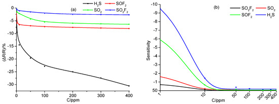 Figure 5a shows the change of gas response with the increase of concentration of SF6 decomposition components. Upon H2S and SOF2 detection, the gas response sharply enhances when gas concentration increases from 1 to 50 ppm, and then tends to linearly increase under high gas concentration of detected gases, from 50 to 400 ppm. This also demonstrates that the Ni-CNT sensor is sensitive to H2S and SOF2. Upon SO2 and SO2F2 detection, the increase of the gas response shows an exponential growth trend. Figure 5b shows the change of sensitivity to SF6 decomposition components; the sensitivity presents an exponential attenuation from 1 to 400 ppm, because it tends to be saturated at a high gas concentration. The attenuation speed is listed in the following order: H2S > SOF2 > SO2 > SO2F2 at the same gas concentration.