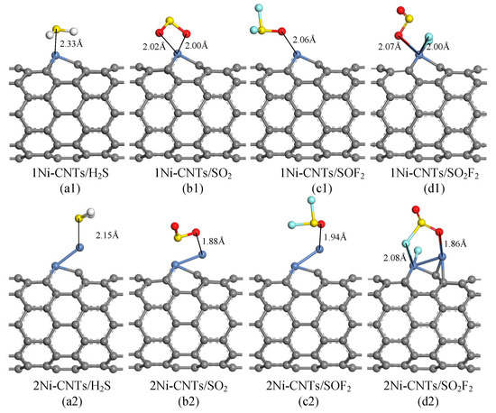 The DFT calculations were performed using Dmol3 package of materials studio. The structure of (8, 0) Ni-CNTs was built by substituting a carbon atom by one Ni atom. In addition, a 20 × 20 × 8.5 Å periodic-boundary supercell was built to avoid the interference of adjacent cells. Then, the optimized adsorption structures of SO2, H2S, SOF2, and SO2F2 on the surface of Ni-CNTs were calculated with different initial gas positions. The Perdew–Burke–Ernzerhof (PBE) function generalized gradient approximation was adopted to treat the exchange-correlation potential. The convergence criterion for energy and force was set at 10−5 Ha and 2 × 10−3 Ha/Å, respectively. The Brillouin zone was sampled with 1 × 1 × 2 Monkhorst–Pack mesh. The adsorption energy (Eads) of the molecules adsorbed on Ni-CNTs was defined by the following Equation (3):