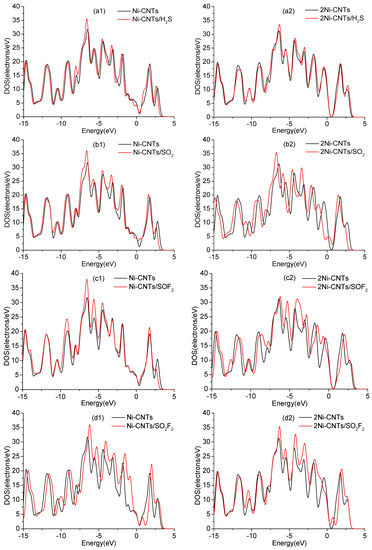 Density of states (DOS) of Ni-CNTs, 2Ni-CNTs, and gas adsorbed Ni-CNTs: (a1–d1) represent gas adsorption on Ni-CNTs, (a2–d2) represent gas adsorption on 2Ni-CNTs.