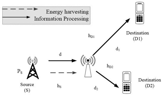 Without loss of generality, we further assume that following the principle of NOMA, the users’ power allocation coefficients are ordered as [26]. In general, in order to ensure the performance of NOMA systems, the NOMA-strong user (i.e., D1) is allocated less power than the NOMA weak user (i.e., D2). As a result, it can be obtained specific SNR for detect D1’ signal at D1 as:
