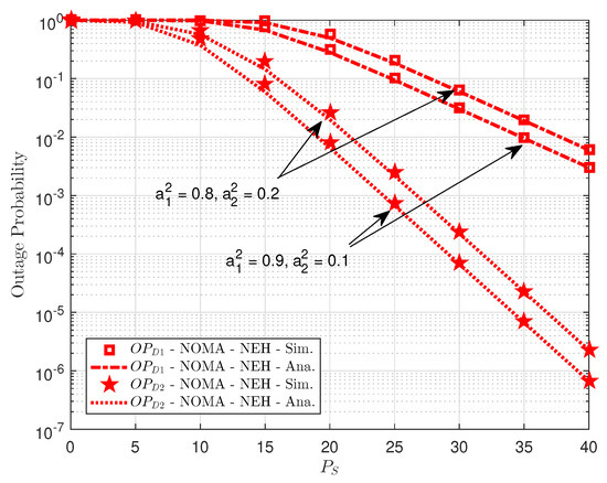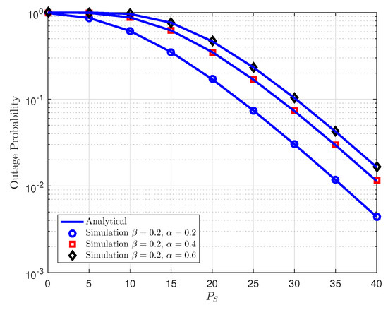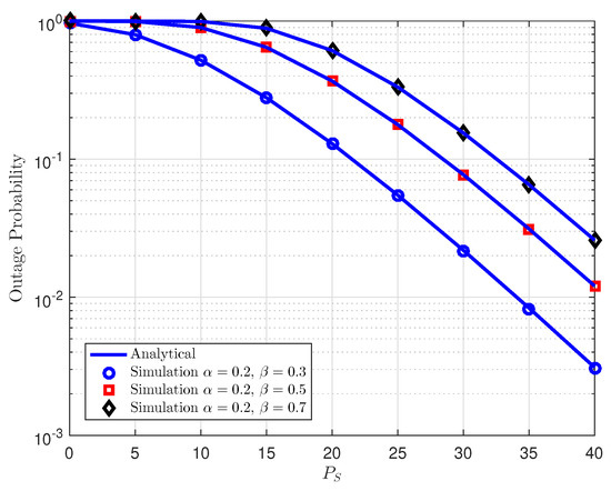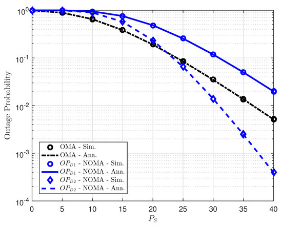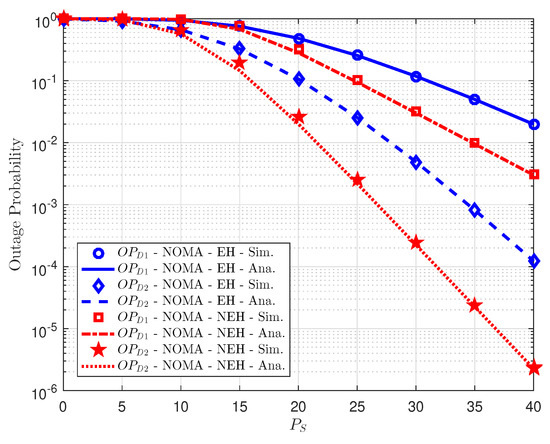 Unless otherwise stated, regarding on energy harvesting protocol, i.e., energy harvesting efficiency is set by , source transmission power, (Joules/sec), and path loss exponent (which corresponds to an urban cellular network environment ). To perform the above outage events, separated probability components must be calculated. For simplicity, we assume that at the fixed rate R. In practice, different rates are assigned for different users, but in this study we set the source transmission rate, R = 1 (bits/sec/Hz) in the delay limited transmission mode for simple analysis. The distances d, and are normalized to unit value. For simplicity, similar noise variances at the relay and the destination nodes are assumed, i.e., different kinds of noise variance is set as . Power allocation factors for NOMA except to specific simulation results. The mean values, of the exponential random variables , respectively, are set to 1.