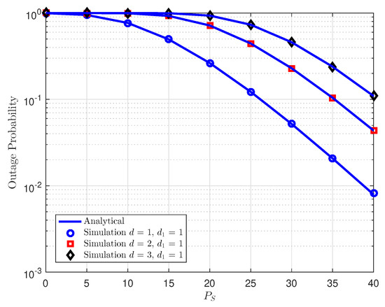 In Figure 4, by changing the relay location, it can be seen the outage performance will be affected by such parameter. Note that two users have different optimal locations. Since the source in NOMA assigns transmit power to the users, the ideal relay location for the user can impact system performance. In this case, as the relay locates far from the source the performance gets worse.