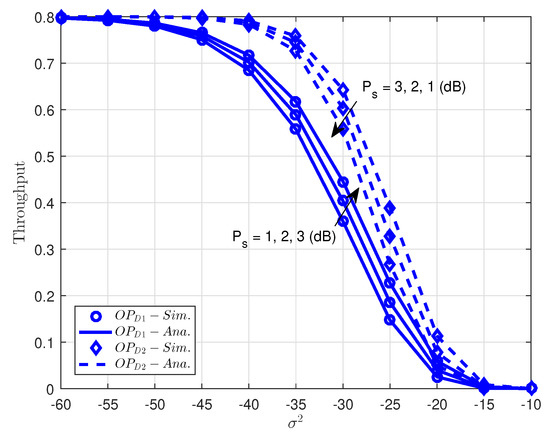 As can be seen in Figure 5, it shows the optimal throughput versus changing variance noise term in EH-NOMA in case of changing transmit power at source. It is noted that throughput can be shown as corresponding fixed rate R. As can be seen clearly, the proposed scheme with higher transmit power ( can realize better throughput performance due to more energy for signal processing. It is noted that noise term contributes to lowest throughput, especially at high noise −20 to −10 dB. In such a scenario, the outage probability of D2 outperforms the outage probability at D1. The reason is that more power allocated for D2 as principle of NOMA as concern before.