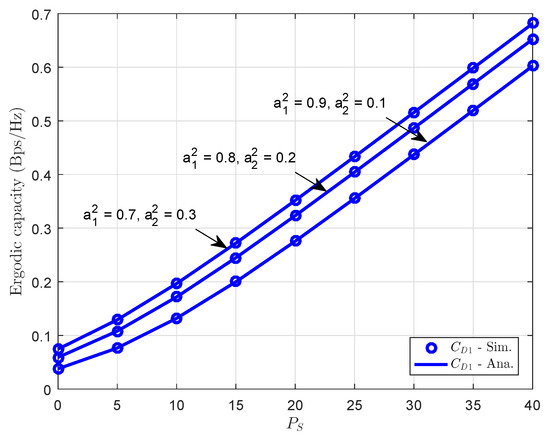 Finally, performance gap in ergodic capacity of both D1 and D2 can be seen clearly in Figure 11. The main reason is that power allocation factor for each user is careful selected to guarantee quality of the proposed system.