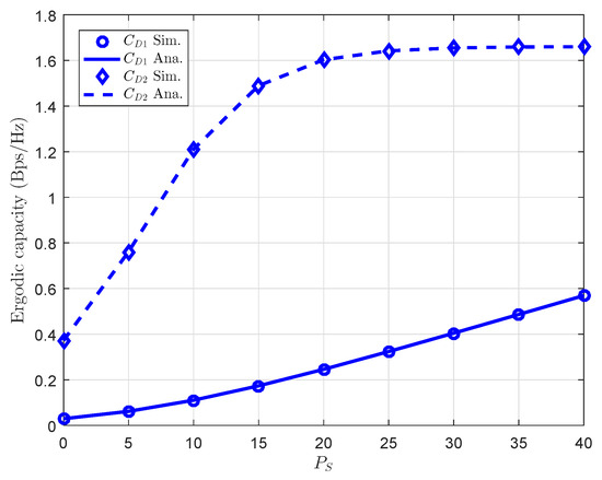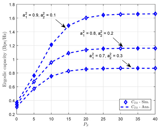 Figure 9 and Figure 10 present the ergodic capacity versus transmit power at source with different power allocation factors in NOMA for each user. One can observe that D1 obtains the highest throughput since it has the higher power assigned among two users. We continue to study the ergodic performance versus the transmit SNR in Figure 8 and the power allocation factors are changed to evaluate its impacts. It can be seen clearly that increasing the transmit power can improve the ergodic capacity (throughput). The figure also demonstrates the existence of the throughput ceilings in the high transmit power region. This is due to the fact that the outage probability is approaching zero and the ergodic capacity is determined only by the targeted data rate. It can be confirmed that the analytic result that is obtained as previous section is valid.