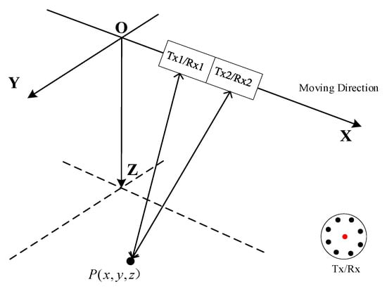 The geometry of OAM-based MIMO-SAR system under a platform coordinate is depicted in Figure 1. The system, which is working in stripmap mode, moves in the X-direction with velocity v. Assuming that there is an ideal point target in the detection area, for simplicity, a 2 × 2 MIMO-SAR system with two uniform circular array (UCA) antennas mounted in the along-track direction is discussed in this paper. The UCA antennas, as shown in the lower right corner of Figure 1, is used to transmit vortex EM waves of different OAM modes [19]. In the UCA antenna, the N array elements are located equidistantly around the circle, and each element is fed by a different phase, i.e., , where l is the OAM mode number, and n is the element number. A single antenna (the red dot) set at the array center is used to receive the echoes.