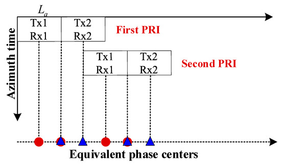 Figure 2 presents the distribution of the azimuth phase centers of the OAM-based MIMO-SAR system. The vertical axis denotes different azimuth times, and the horizontal axis denotes different equivalent phase centers. At every azimuth time, each receiving antenna can receive echoes from both Tx1 and Tx2. The red dot denotes the equivalent phase center of Tx1/Rx1 or Tx2/Rx1, while the blue triangle denotes the equivalent phase center of Tx1/Rx2 or Tx2/Rx2. There exist three equivalent observation channels at every azimuth time. In the case of SAR imaging, a wider image swath width can be obtained, due to a reduction of the pulse repetition frequency (PRF) by a factor of three compared to a single-channel system. Besides, the additional phase centers yield extra and longer baselines for the ground moving target indication (GMTI) and along-track interferometry (ATI) applications [2]. Moreover, in contrast to plane EM waves, vortex EM waves possess a wider beam width in both range and azimuth directions. Consequently, the OAM-based MIMO-SAR system can simultaneously realize the high azimuth resolution and the wide swath width with better performance.