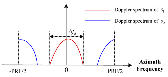 It can be seen from Equation (12) that, due to the RDE, the echo signals related to the different OAM modes locate at different azimuth frequencies. Assume that is 0 rad/s and is PRF/2; Equation (12) can be rewritten as: