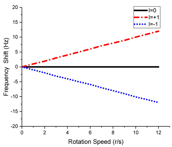 The rotational Doppler frequency shifts of different OAM echoes versus the rotation speed are shown in Figure 7. For conventional plane EM waves (l = 0), there existed no frequency shift, whether the incident wave rotated or not. For vortex EM waves, the frequency shifts of the two OAM modes, i.e., l = +1 and l = −1, were different. The frequency shift also increased with the rotation speed. The experimental results showed that with the rotational vortex EM waves, a different OAM mode brought a different frequency shift at the receiving end, which made it possible to distinguish different OAM modes in the frequency domain.